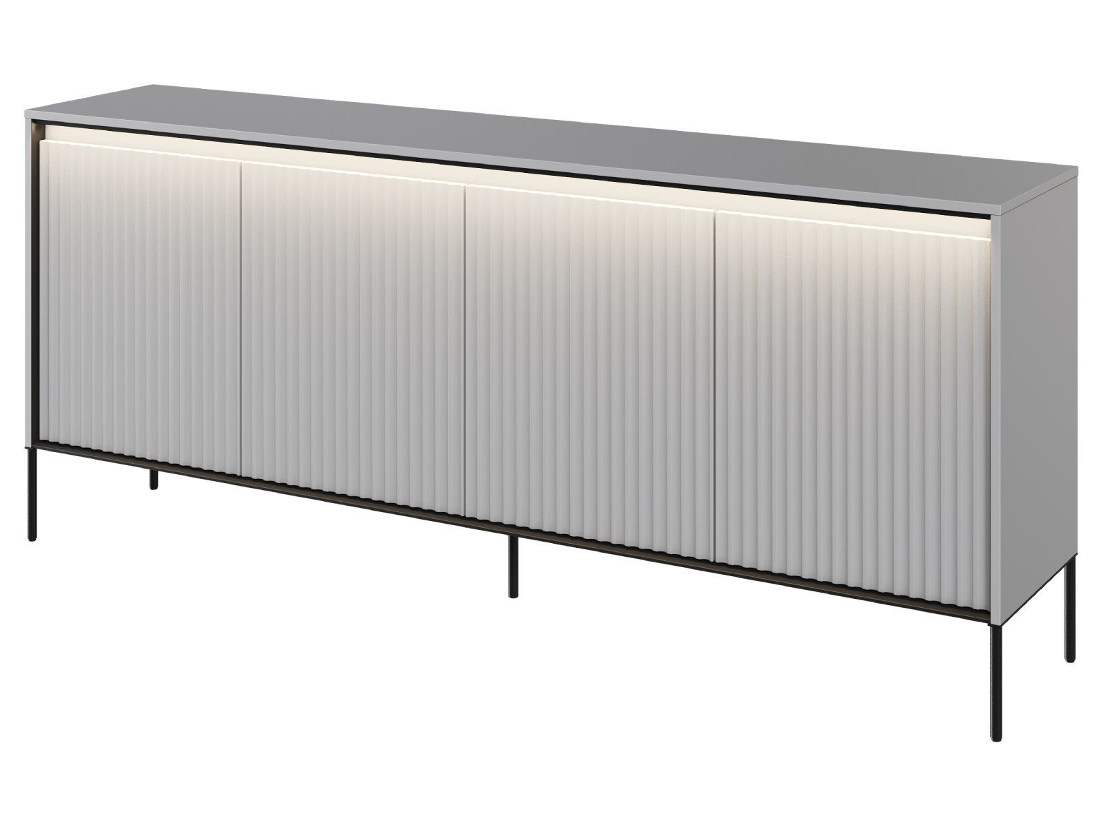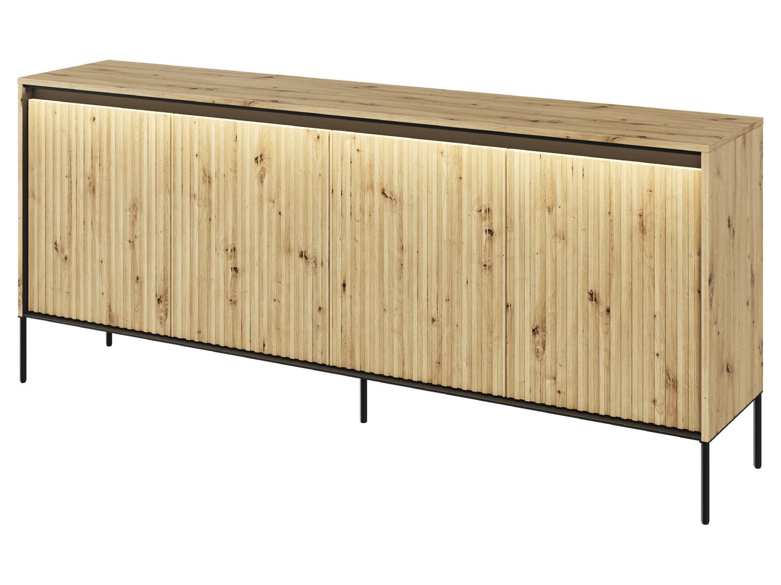 Mit ihren 4 großzügigen Regalfächern bietet die Kommode reichlich Platz für Bücher, Geschirr, Deko oder persönliche Gegenstände. Die integrierte LED-Leiste (Energieklasse A++) hebt die besondere Struktur der Fronten hervor und schafft ein elegantes Ambiente im Wohnzimmer. Die robuste Konstruktion aus hochwertigen Materialien garantiert Langlebigkeit und Pflegeleichtigkeit.