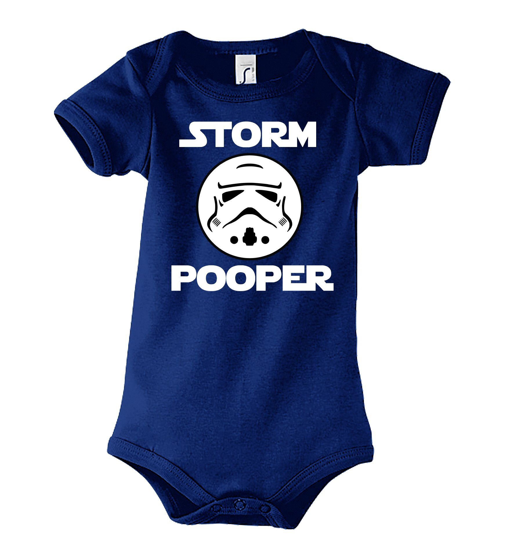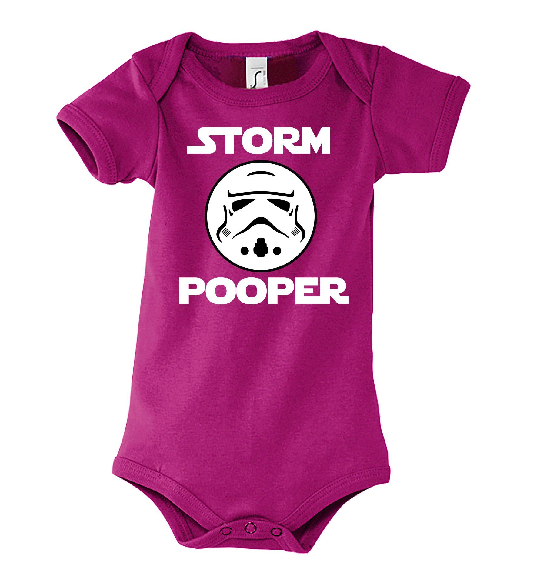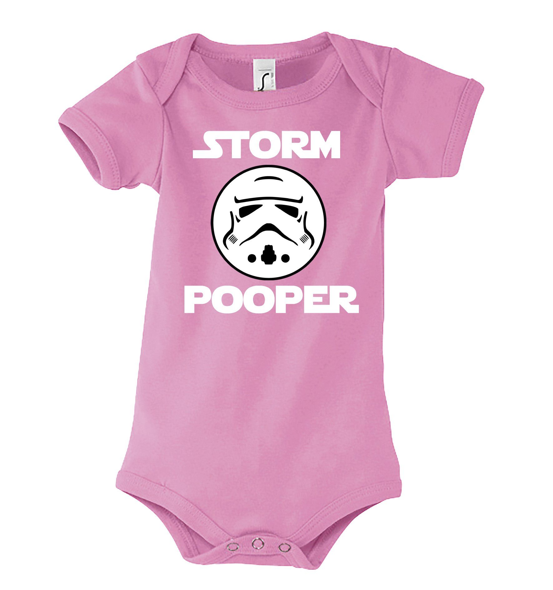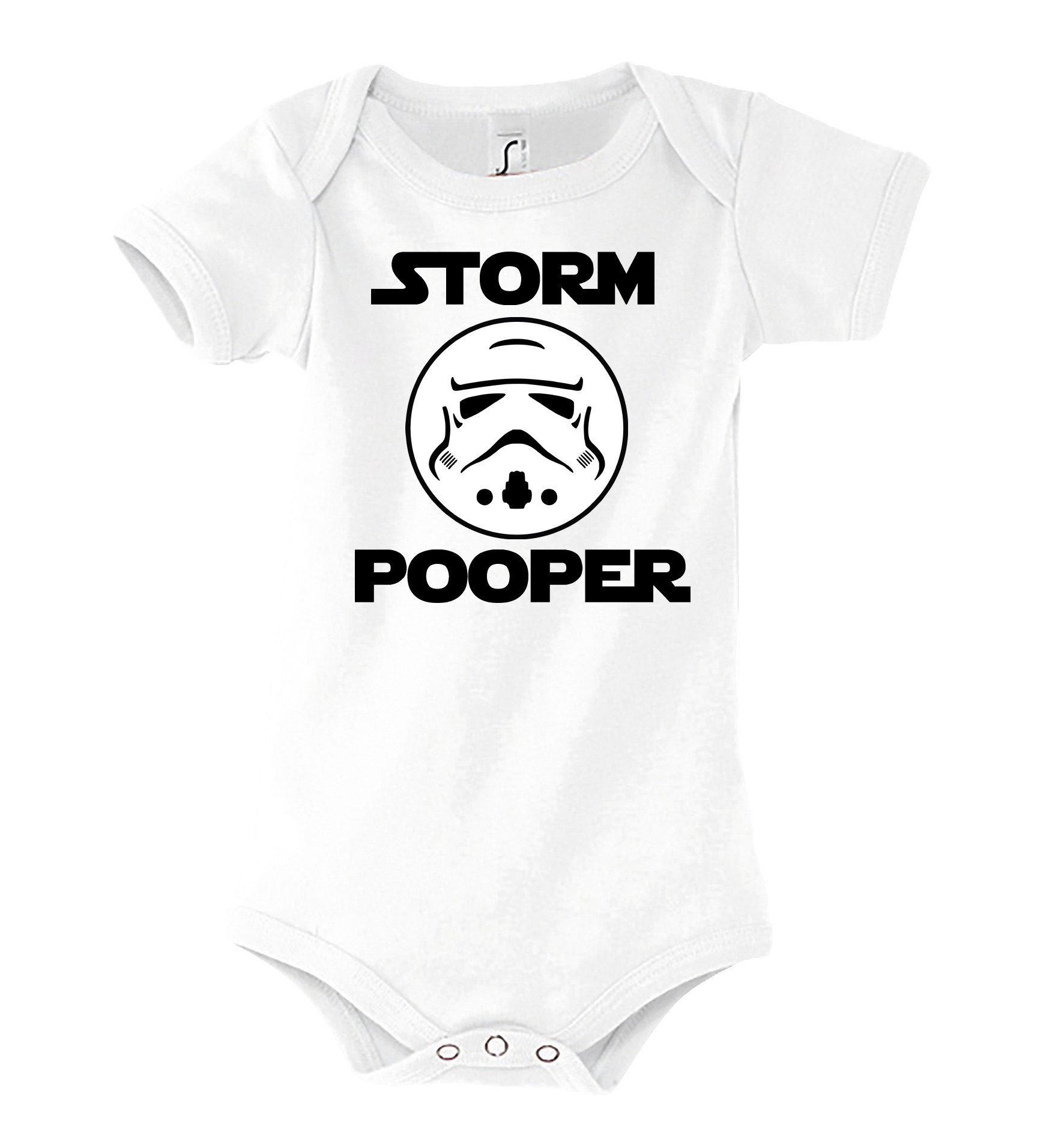 Kurzarm Baby Strampler mit lustigem Storm Pooper Spruch Logo Aufdruck für alle Nostalgie Film Fans und Sci-Fi Nerds