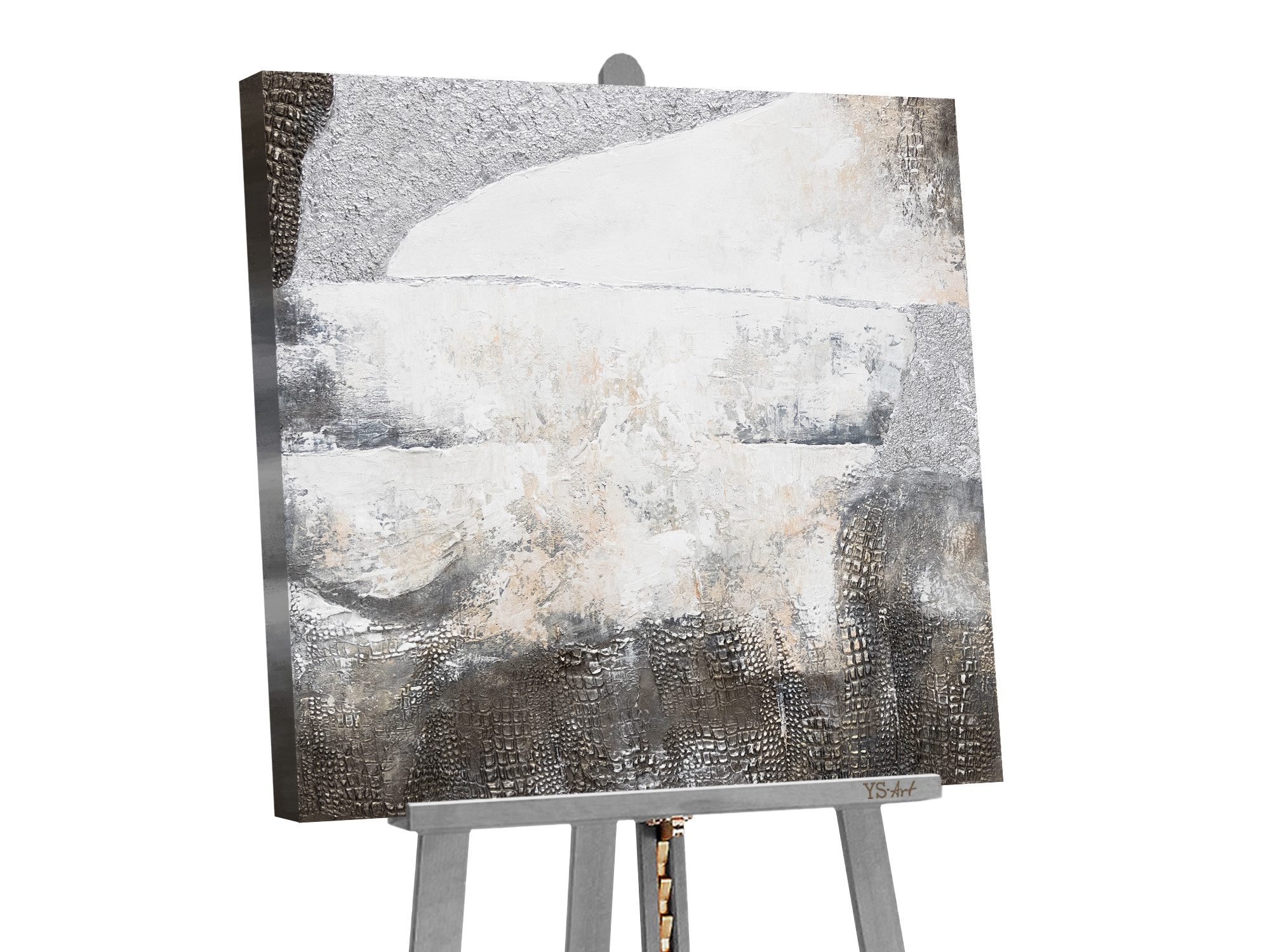 Handgemaltes Abstraktions Gemälde der exklusiven Serie Trend in der Розмір 100 × 100 cm "Außergewöhnlich". In grauen und weißen Farben gemalt und mit Blattgold veredelt.