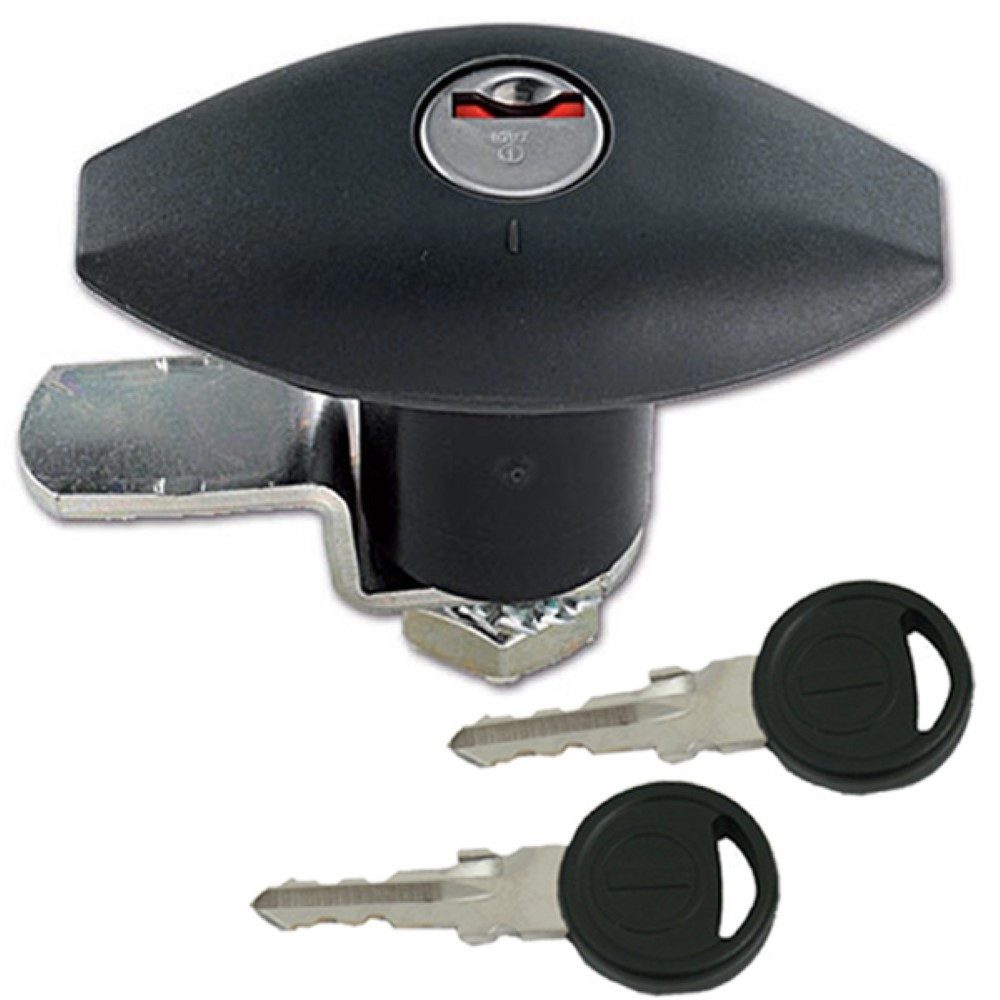 Hinweis: Durch das drehen des Schlüssels springt der schwarze Griff vor und kann dann durch drehen das Schloss öffnen. Den Zylinder wieder mit dem Schlüssel verschließen und durch drücken auf den schwarzen Griff verriegelt dieser hörbar.