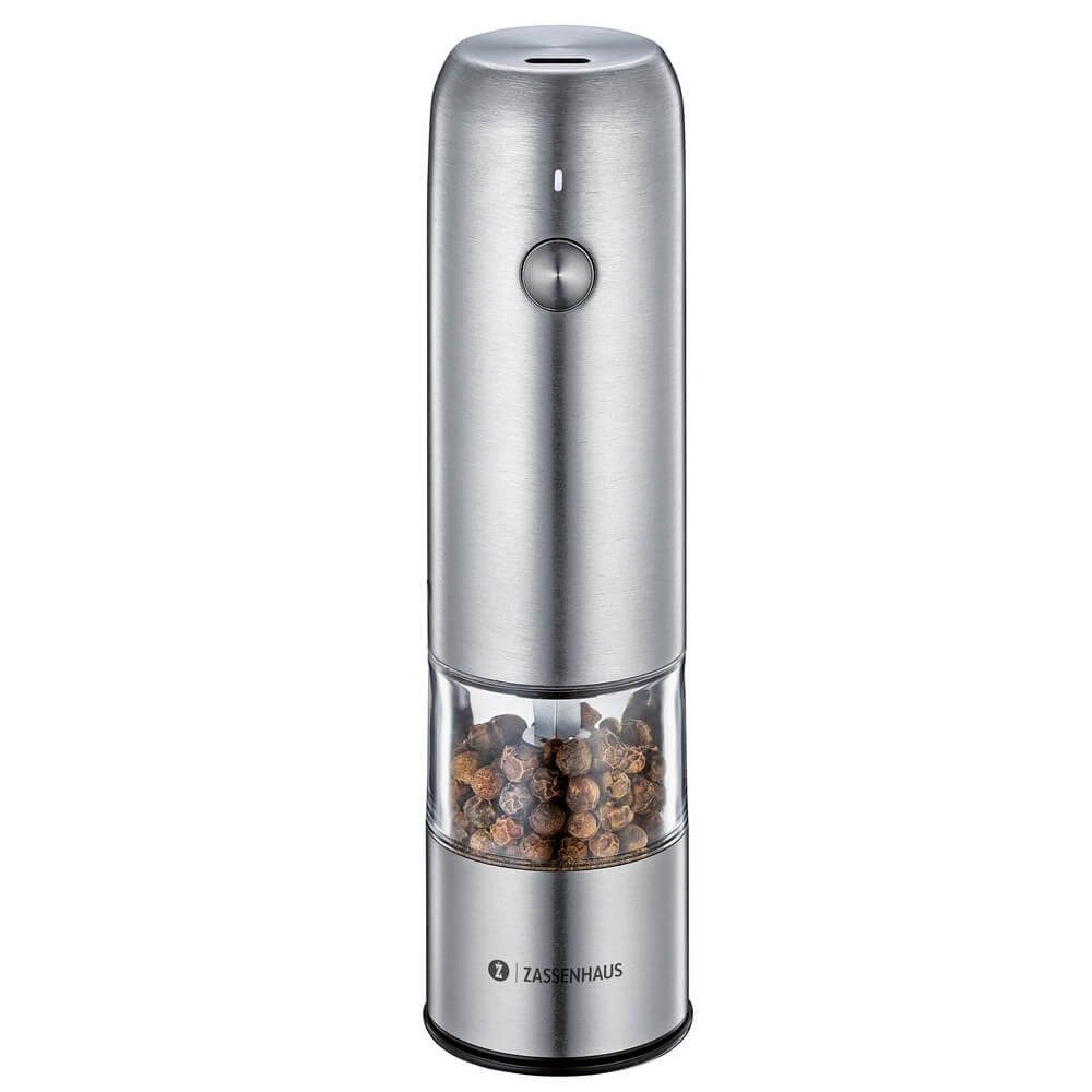 ine neue elektrische Pfeffermühle ist aus Edelstahl, 14cm hoch und aus der Köln Serie von Zassenhaus. Der eingebautet Lithium-Ionen-Akku kann mit einem USB Type C geladen werden und bereitet dir somit lange Freude an dem Produkt. Das Mahlwerk aus Hochleistungskeramik ist am Unterteil stufenlos einstellbar und auch für Salz und getrocknete Kräuter geeignet.