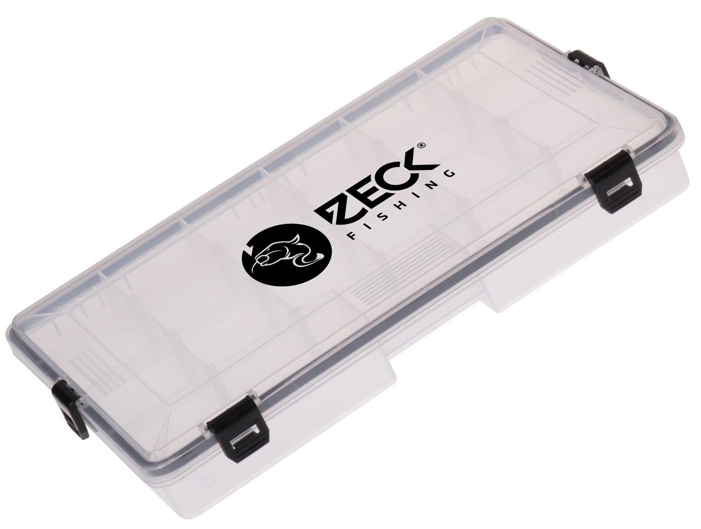 Zeck Tackle Box WP - Angelbox - Die Kleinteilebox von Zeck Fishing dient zum Aufbewahren und zum Transport von Wallerzubehör beim Welsangeln. In ihr können verschiedene Zubehörteile einsortiert werden, wie beispielsweise Wallerwirbel, Wallerhaken und Unterwasserposen, damit alles seine Ordnung hat und sofort griffbereit ist, wenn es benötigt wird. Die Довжина der Unterteilungen kann man durch die mitgelieferten Trennteile, die einen guten Seitenhalt bieten, flexibel auf die eigenen Bedürfnisse sowie das Welszubehör anpassen. Der Deckel der Tacklebox ist mit einer umlaufenden Dichtung ausgestattet, die dafür sorgt, dass kein Regenwasser eindringen kann und der Inhalt somit sehr gut vor Feuchtigkeit geschützt ist. Zudem machen vier Verschlüsse die Angelbox sehr stabil und sie verhindern ein ungewolltes Öffnen.