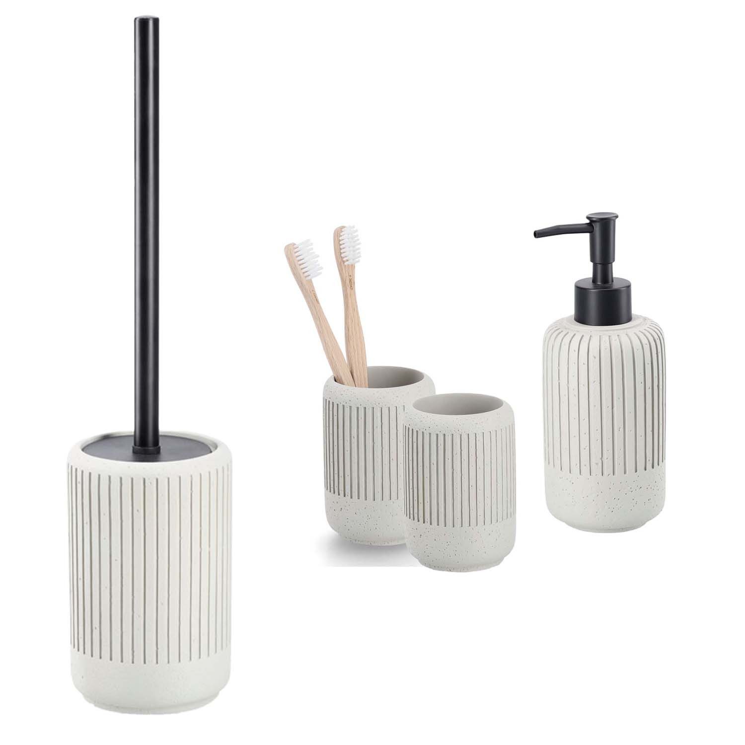 1x 4-teiliges Badaccessoire-Set - Zement Hellgrau, bestehend aus: 1x Seifenspender, 2x Zahnputzbecher, 1x WC-Bürste