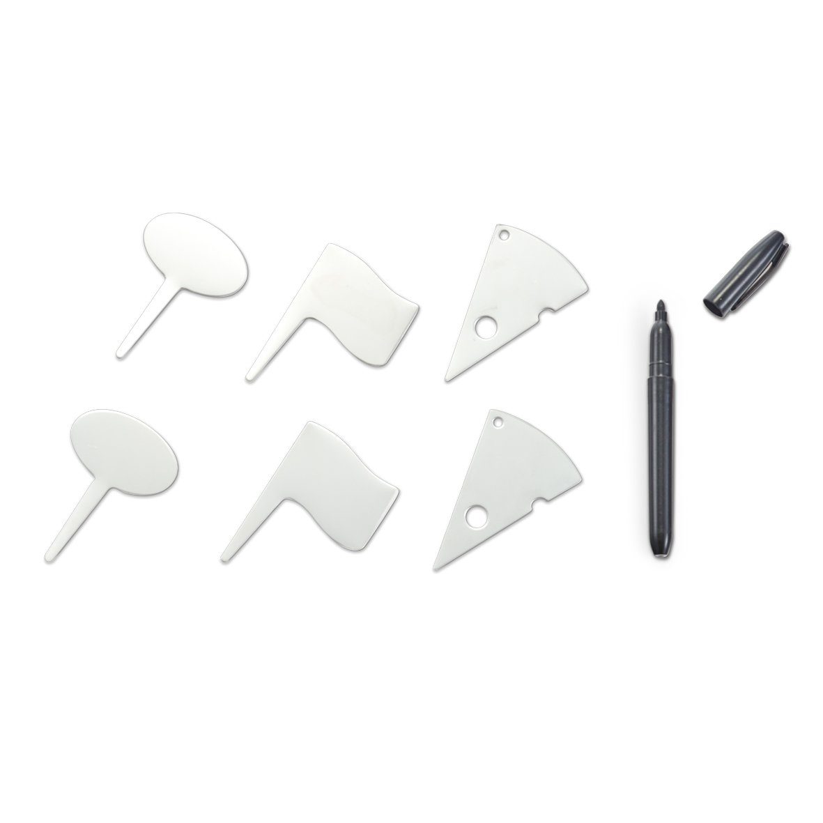 Mit unserem praktischen, 7-teiligen Käse-Marker-Set können Sie Ihren Käse stilvoll servieren. Durch die Marker aus leicht zu reinigendem Edelstahl lässt sich der Käse ganz einfach beschriften, sodass immer nachvollziehbar ist, welche Käsesorten serviert werden. Im Lieferumfang ist ein abwischbarer Filzstift enthalten. Durch die ausgefallene Verpackung ist das Set auch perfekt als Mitbringsel bei der nächsten Familienfeier oder als Geburtstagsgeschenk geeignet.