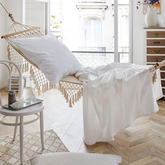 Für die Wohnung eignen sich Hängematten aus Baumwolle – sie sehen besonders gemütlich aus, sind robust und meistens in der Maschine waschbar.